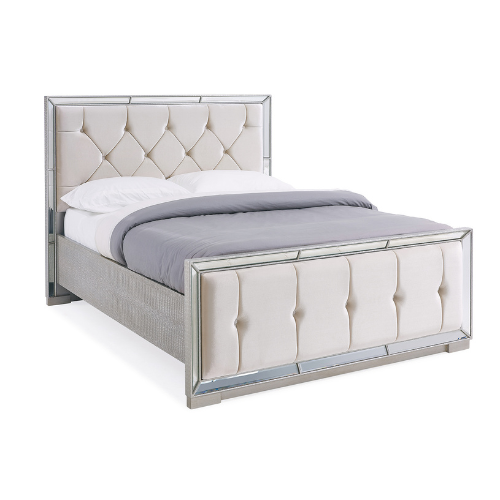 This stunning bed frame features a harmonious blend of materials, combining sleek glass panels with silver leatherette accents and sumptuously soft, cream velvet upholstery with deep button detailing for an eye-catching look of pure luxury.